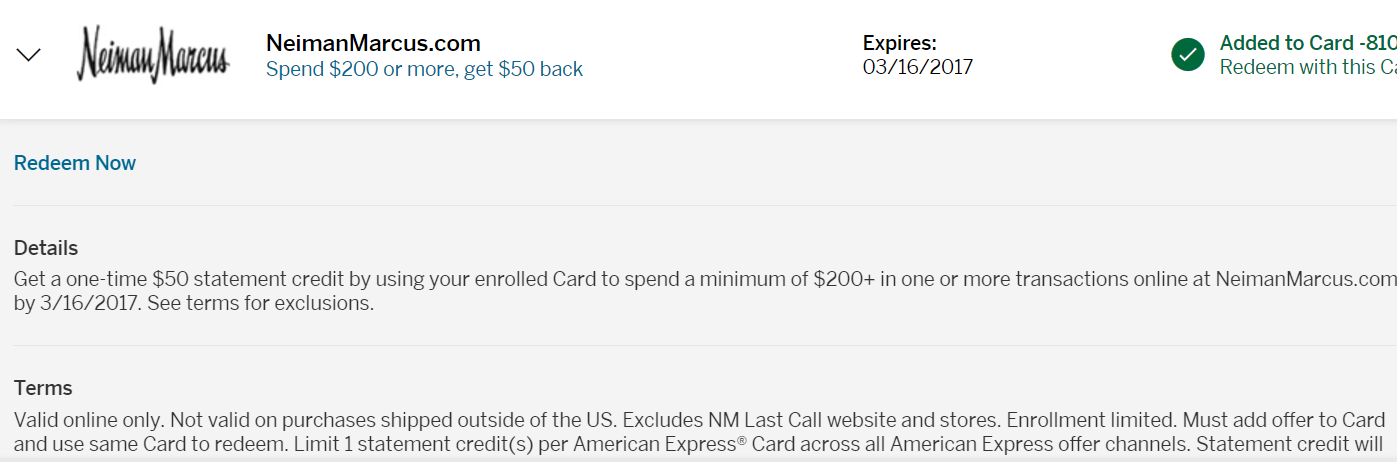 - Offer 介绍:NeimanMarcus.com 一次或者多次交易总和满 $200,返 $50(只有 online 有效,在店里买是无效的)。3/16 日截止。