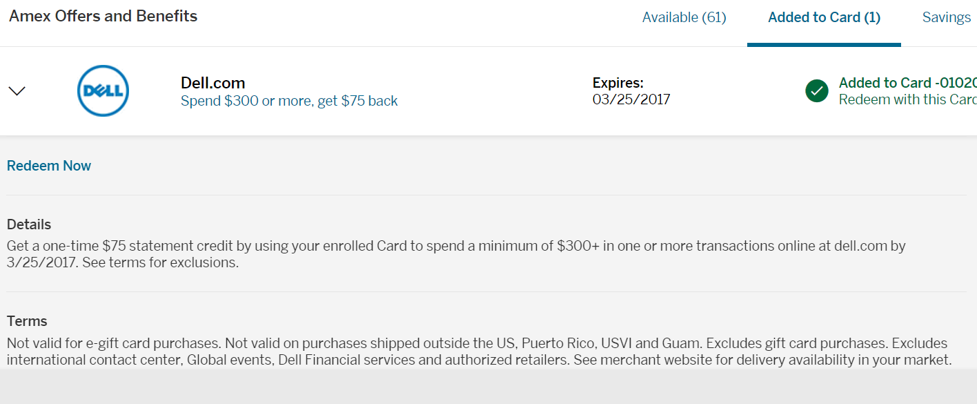 - Offer 介绍:dell.com 一次或者多次交易总和满 $300,返 $75 或者 7.5k Membership Rewards