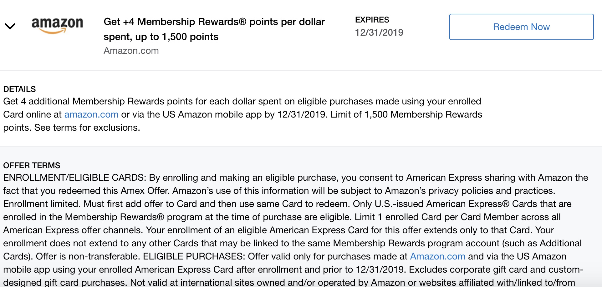 - Amazon, Get 4 Additional Membership Rewards Points, Up To 1,500 Bonus Points: 12 月 31 过期。用完应该没难度,你也可以买 $375 的 amazon gc,省的要凑这个数字。这个 offer 貌似范围特别广,我所有 MR 卡都有,当然只能加一次。如果你有副卡用户,副卡也可以单独加这个 offer,当然积分最终是到你账户里面的。另外要特别注意,如果一开始没看到这个 offer,而且 offer 数量=100 的话,先把一些烂 offer 都加完,然后 log out log in,再重新找找,如果再次登录后 amex offer 小于 100,而且没有 offer,才算真的没被 target 到。