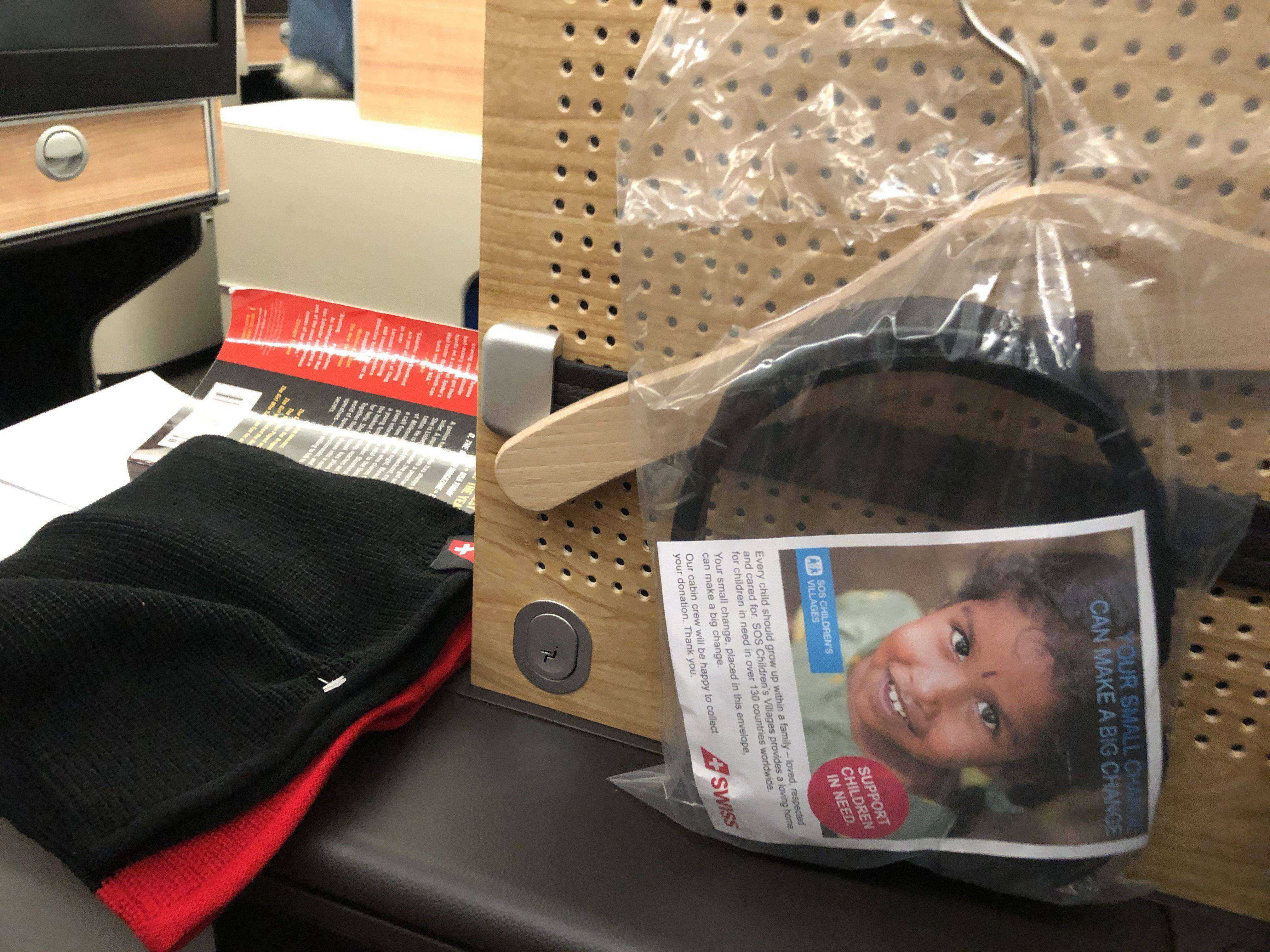 瑞航的洗漱包很有意思,装在一个滑雪帽里面(下图左)。不过对于我来说,这种东西我都是拿来纪念的,也没打开。耳机是 swiss 自家的,途中用了下,比起自己的 QC35,只能说嗯。