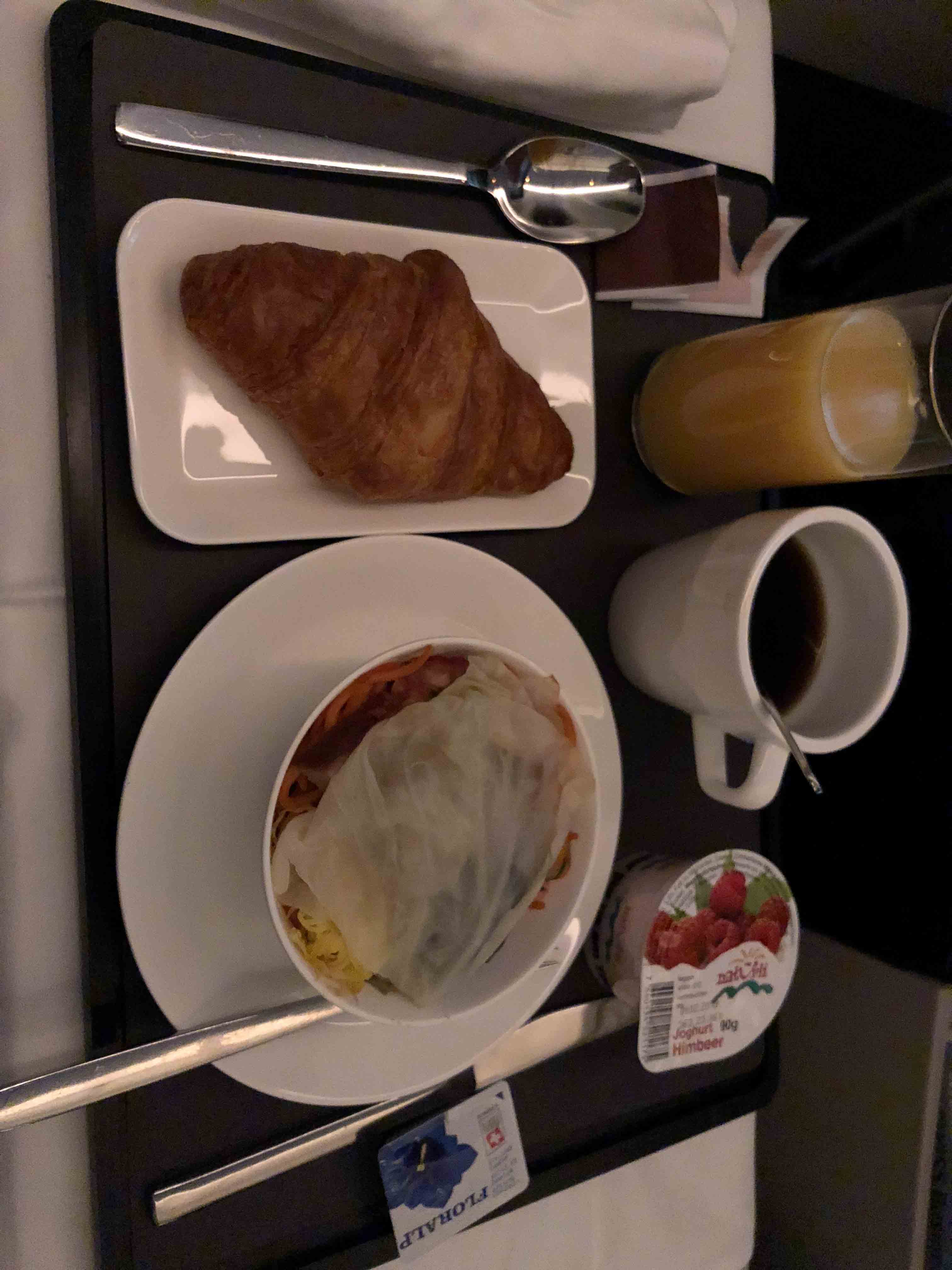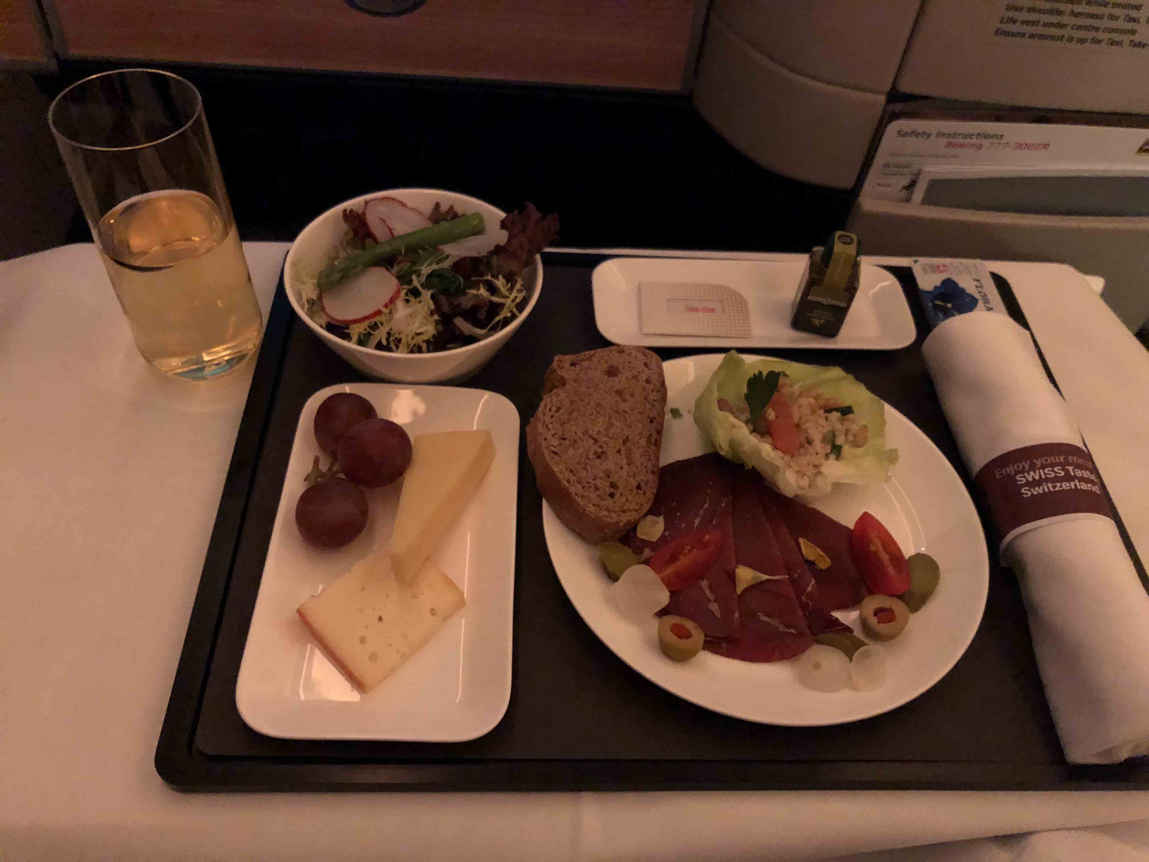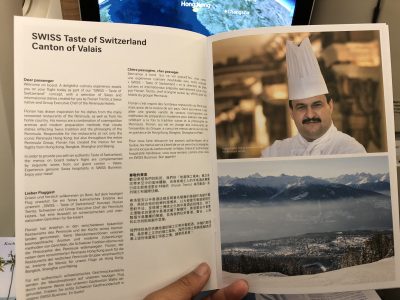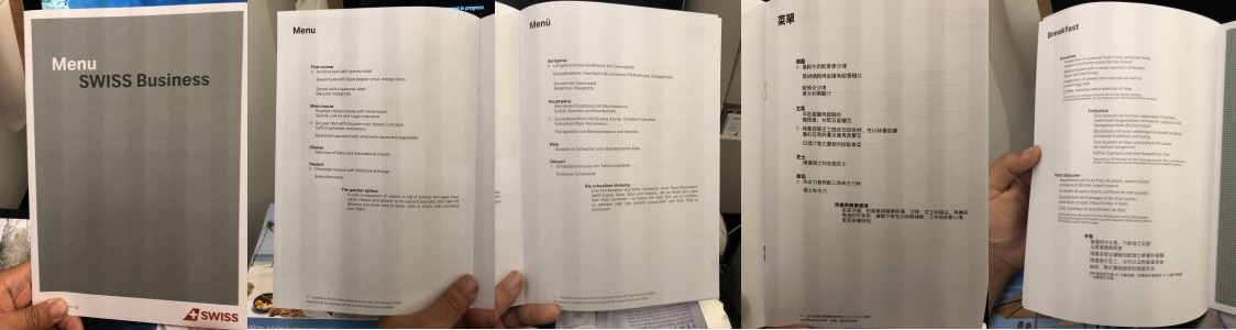 因为是从香港起飞,菜单提供中文版本。不过空姐们都不会说普通话,大家只能挑着讲瑞士联邦四种官方語言的一种,分別是德语、法语、意大利语和罗曼什语