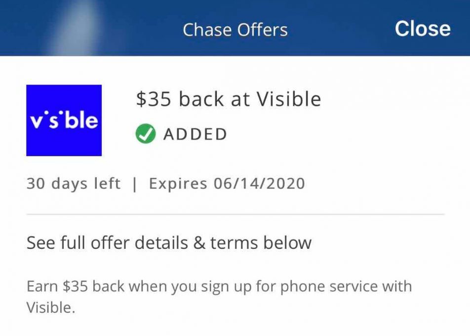 【05/15 更新】Chase Offer 及 BOA Deals 出现了一个 Visible $35 off 的 offer (Targeted),配合起来成本可以降低至 $125,目前已知的出现在 Freedom 及 CIP(手机消费 3xUR)这两张卡上,offer 截至 2020/06/14。值得注意的是,Visible 付款的时候,经常也不给刷 Chase, YMMV. HT: az、HJ、微信读者 Sky。另外,TCB 还有一个小羊毛,额外 $3 off,参考这则 101 快讯。