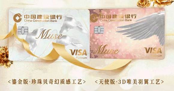 第二张是 Muse,对于有海外线下购物需求的人来说,选好日期在特定的免税店购物,这张卡也不错(由于本季度,建行返现缩水了,这卡变相减弱了),刚出时候,可以单独申请,后面改为必须联合全球乐购卡银联版一起申请,副卡开卡也不便捷了。这个卡有两种版面,颜值刚刚的: