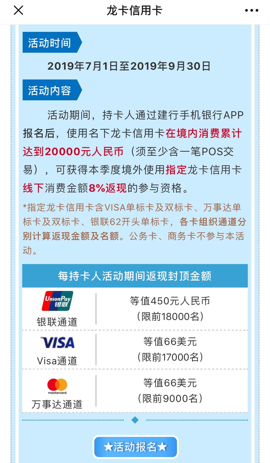 - 活动内容:需使用名下龙卡信用卡在境内累计消费 20K RMB(须含一笔 POS 消费),即可获得 8% Cashback 资格(你只需要在活动期间内完成 20K RMB 境内消费即可,不限于在境外刷卡之后完成),报名入口需要前往建行 app 报名,10 月 1 日开放,直接名额限制看图吧: