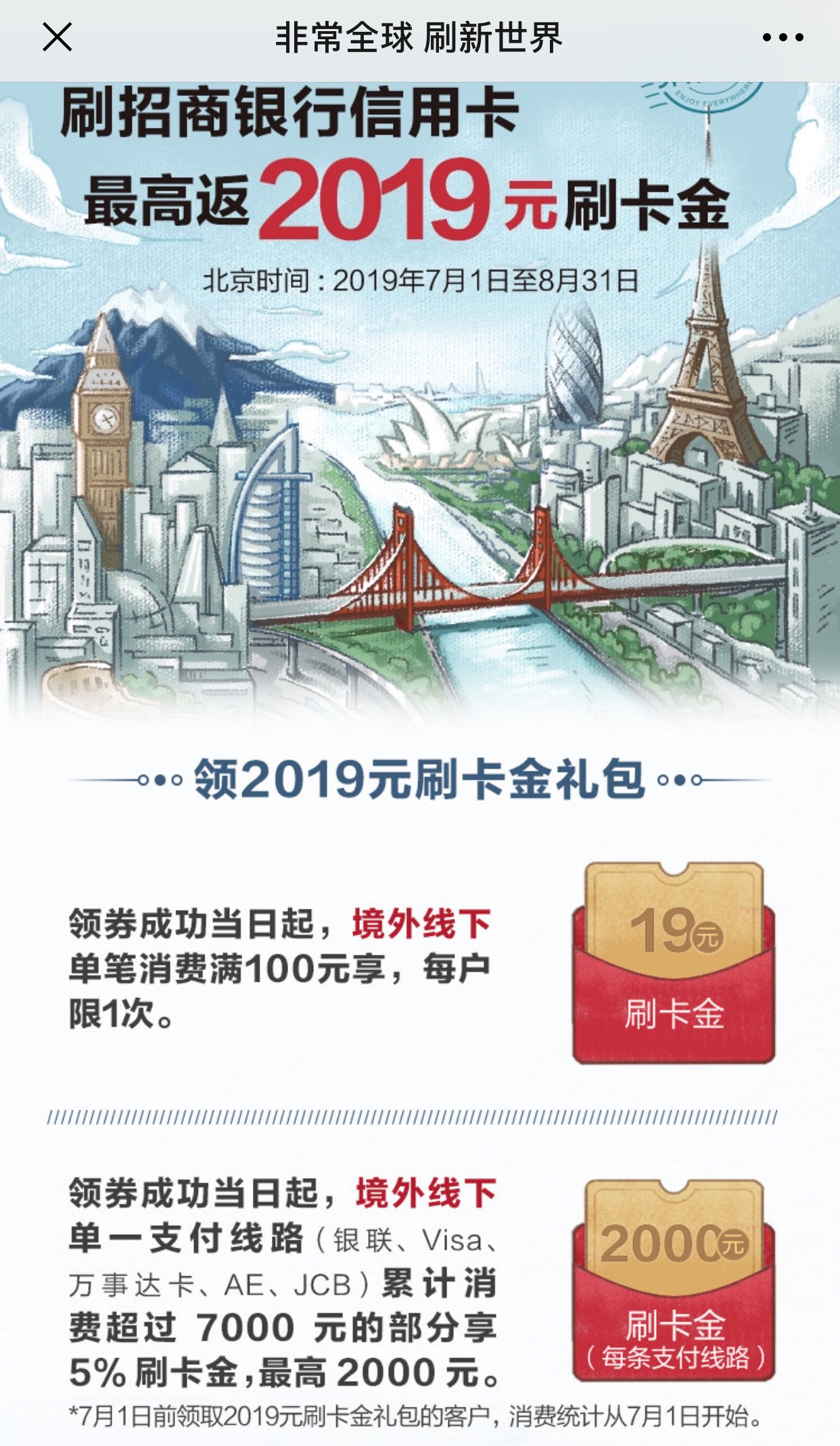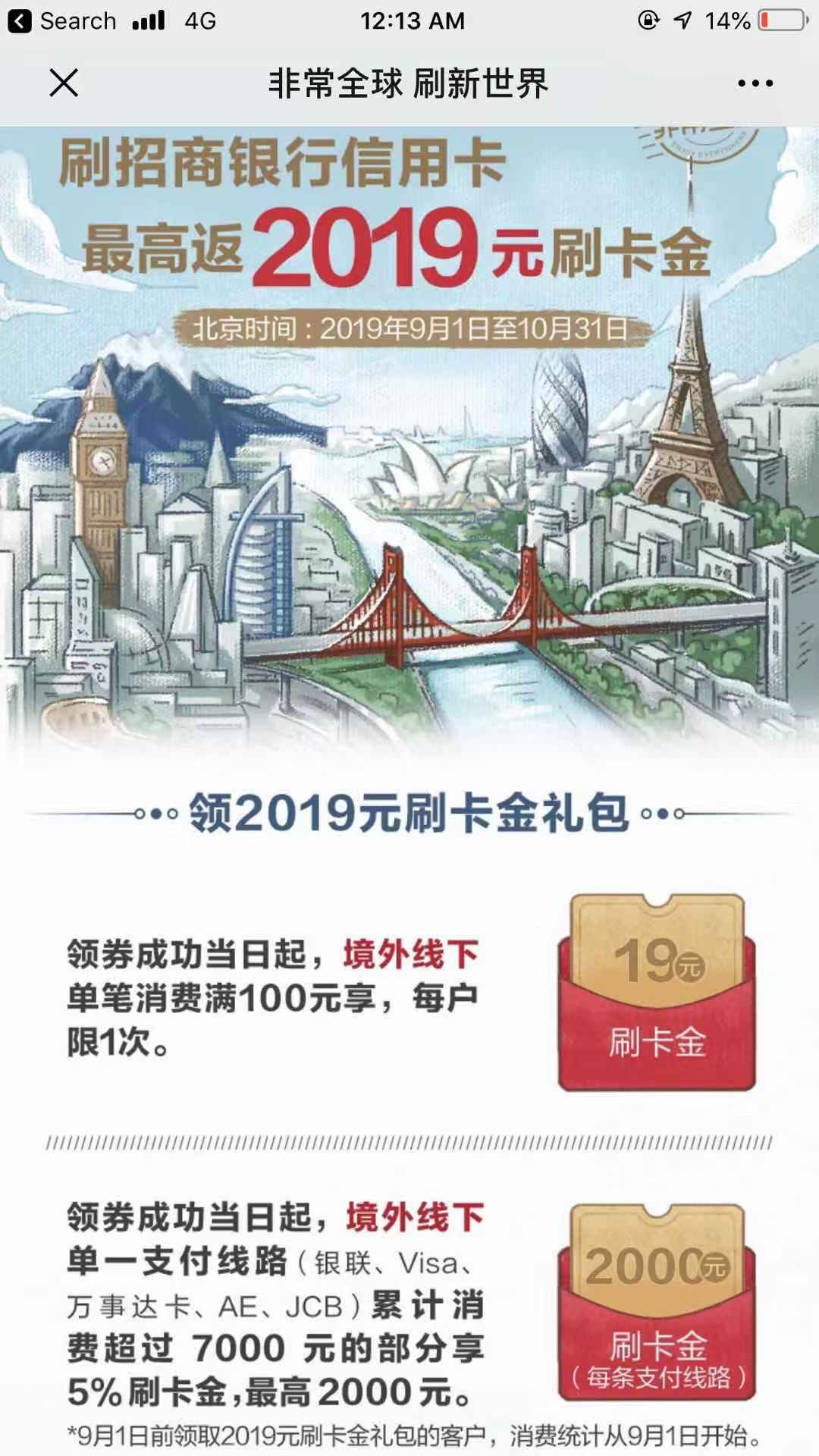 活动三:2019.10.1~2019.12.31,留学及考试类消费 5%,包含通过留学网站产生的旅游支出(比如 Studentuniverse)。单笔消费 100, 5% 返现,每个月最高 50 美金。【点击前往链接】