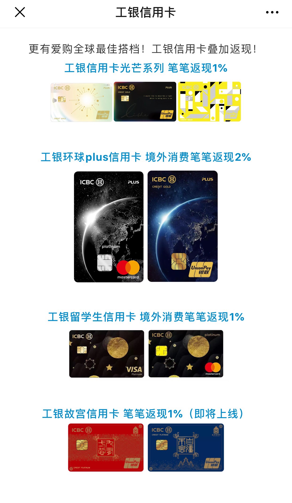 工商银行同时推了几款境内境外笔笔 1% 返现卡,感兴趣也可以去了解下,如下: