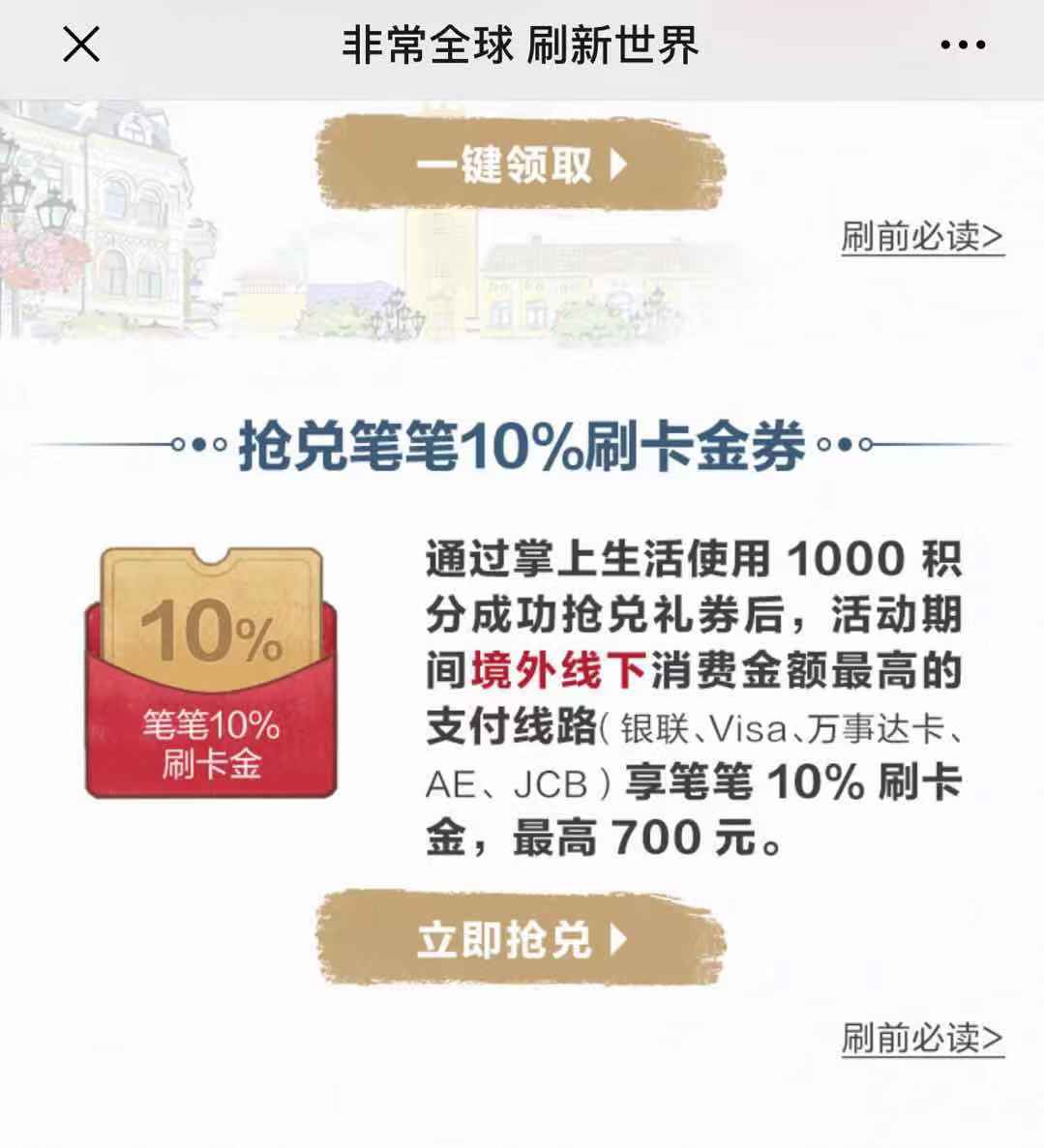活动 1: VISA、Master 境外线上线下,每个月享单笔满 1000RMB,返现 12% 即 120RMB,线上线下每人每个卡组织限分别享一次 120RMB 返现。相当于每个月,如果你同时持有 VISA 跟 Master,你最多可以拿到(120+120)X2= 480RMB 返现。每月总名额不少于一万个,名额有限先到先得。(第一次见用“不少于”来限额的..)