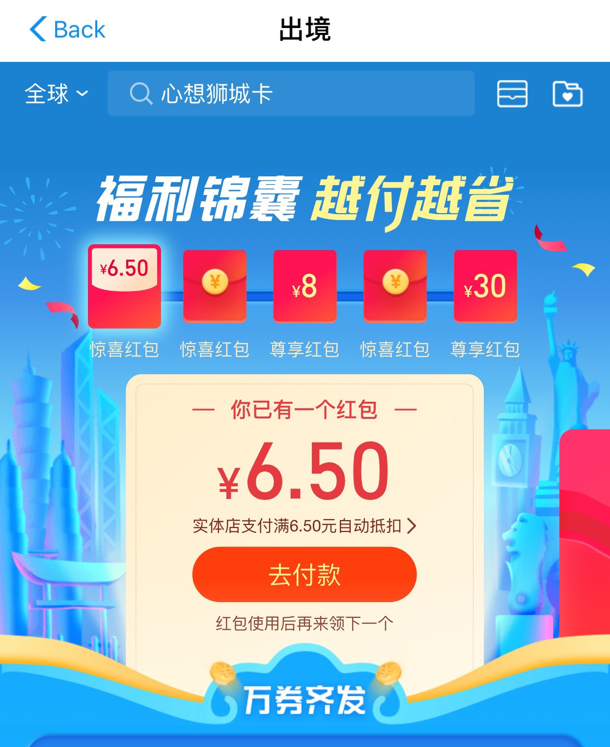 【2019.10 更新,已过期】活动名称“福利锦囊 越付越省”,入口:支付宝,检索出境。活动有效期较短,持续至 10 月 7 日。