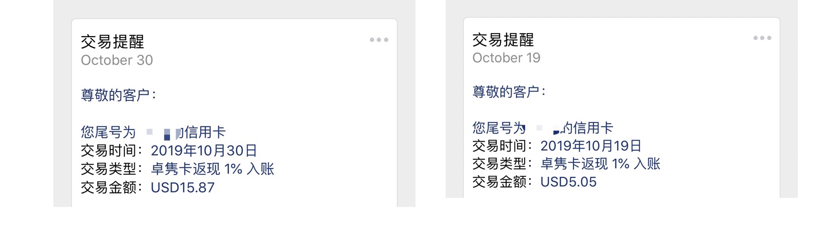 - 返现情况:每个自然月,银联消费满 40K RMB,返 2200 RMB)V/M 刷 6000 美元,返 320 美元,返现比例大概在 5%-5.5%。