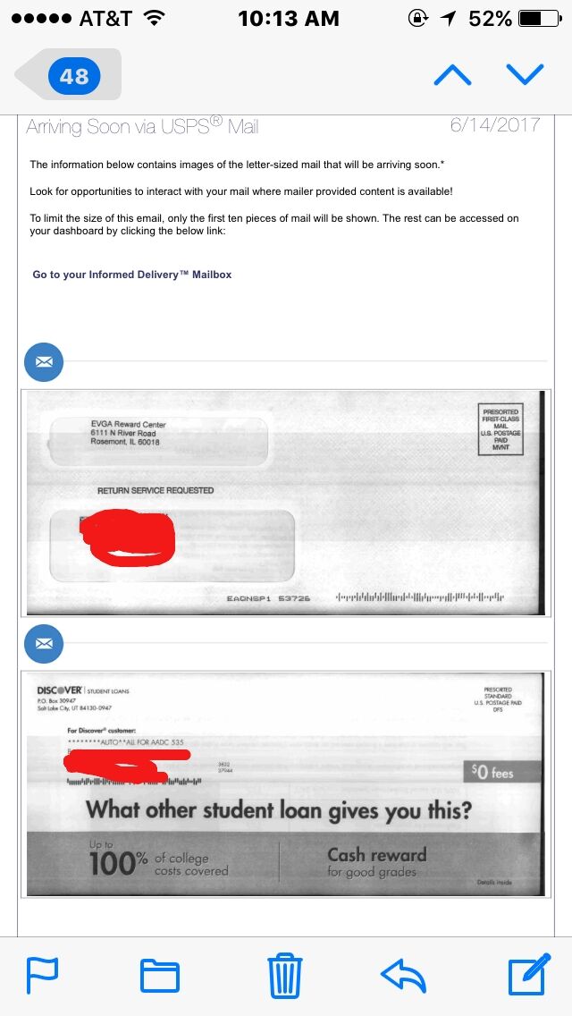 USPS 除了有包裹提醒功能,最近还新加了 Informed Delivery 功能。此功能会自动扫描邮寄给你的信件,然后发到你的邮箱。对于苦等平信邮寄信用卡的同学来说,能早点看到是最好的。