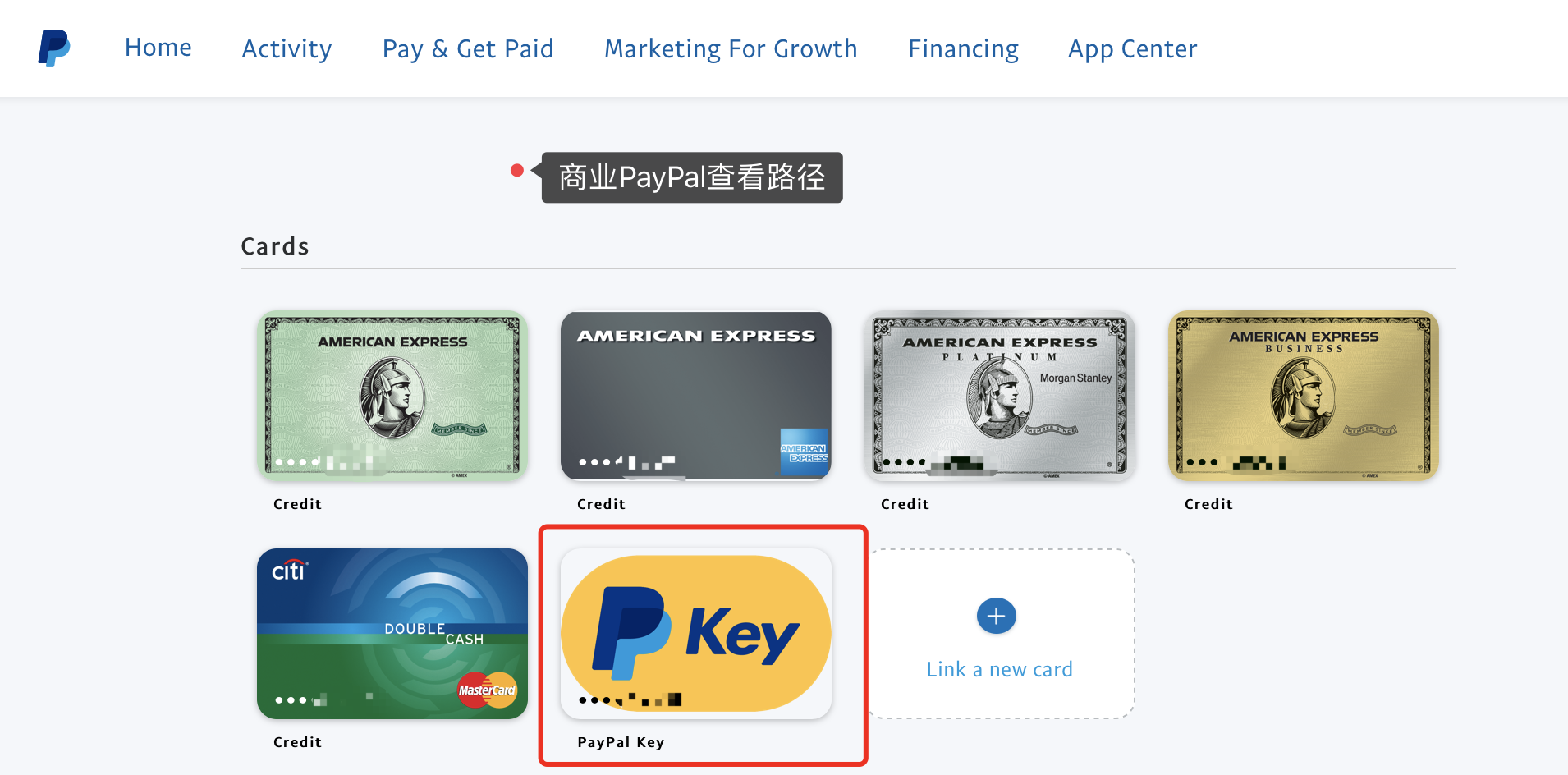 商业 PayPal 账户查看麻烦一些,在下图的地方才看得到。