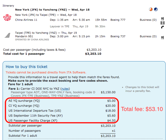可以看到,华航/华信在大陆的航点众多,遍布大多数省份,适合家在一二三线城市的朋友。再次强调一点,华航不会有东航南航那样的幽灵票,而从下图可以看到,相比东航动辄 $200+的燃油费,华航的税费算是很良心,只要 $50+(配合上撸来的达美 GC 口味更佳):