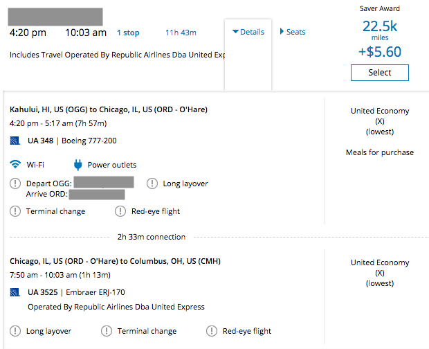 一般来说夏威夷和哥村之间的里程票一停的不多,UA 航班就用 新航里程 出,达美单程航班就用法航出,达美往返航班就用 大韩里程 出。如果你住在美西,还能用 英航里程 出 AA 或阿拉斯加航空的直飞航班。由于在我需要的时间在 UA 官网上只有 UA 的经芝加哥一停航班,所以还是用新航里程来出: