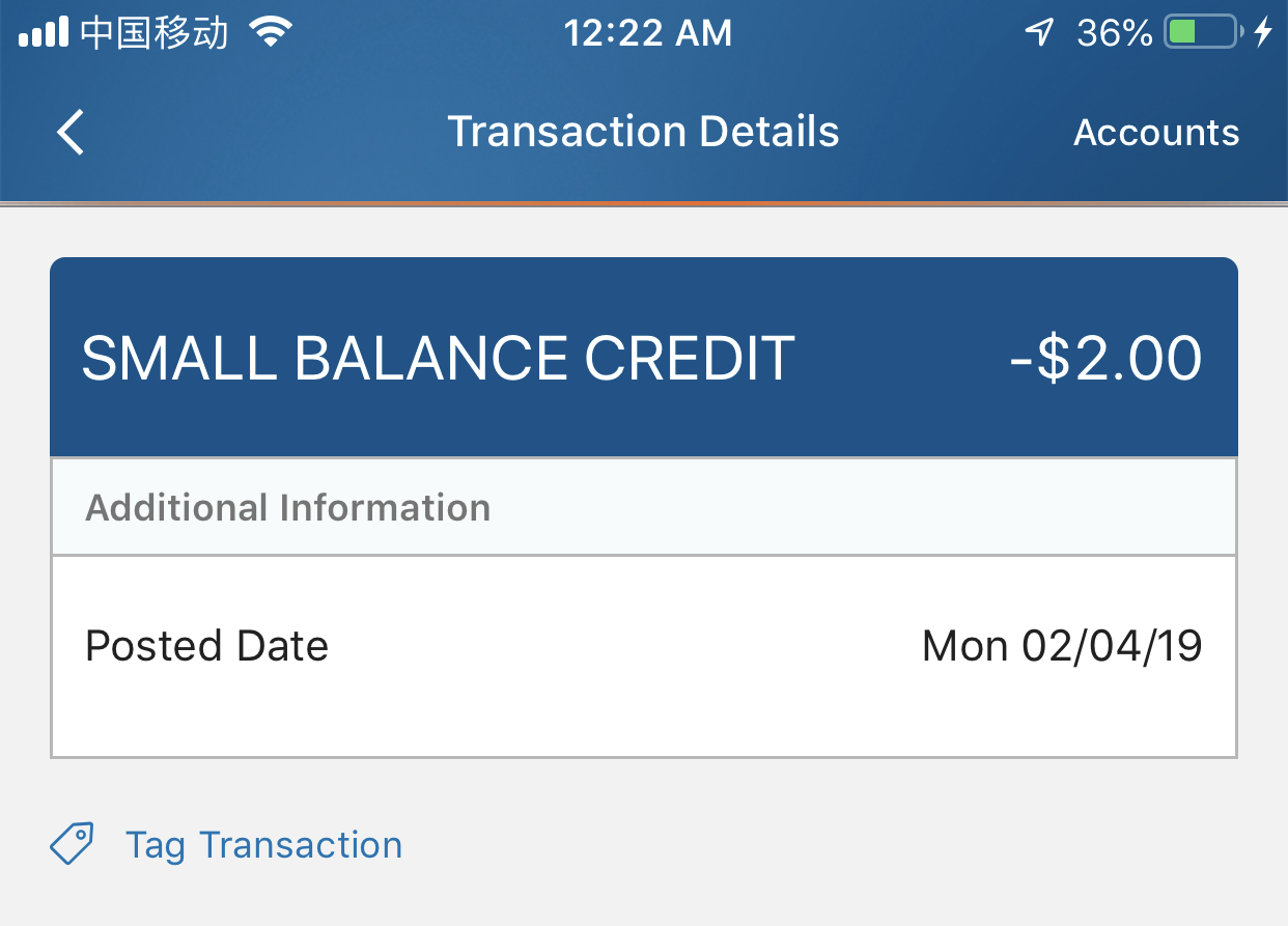 举个栗子,如果你出账单的时候,欠了银行 $1.99,有的银行会直接把这个钱送给你,你出账单的时候 statement balance 直接是 0,不欠银行钱。。