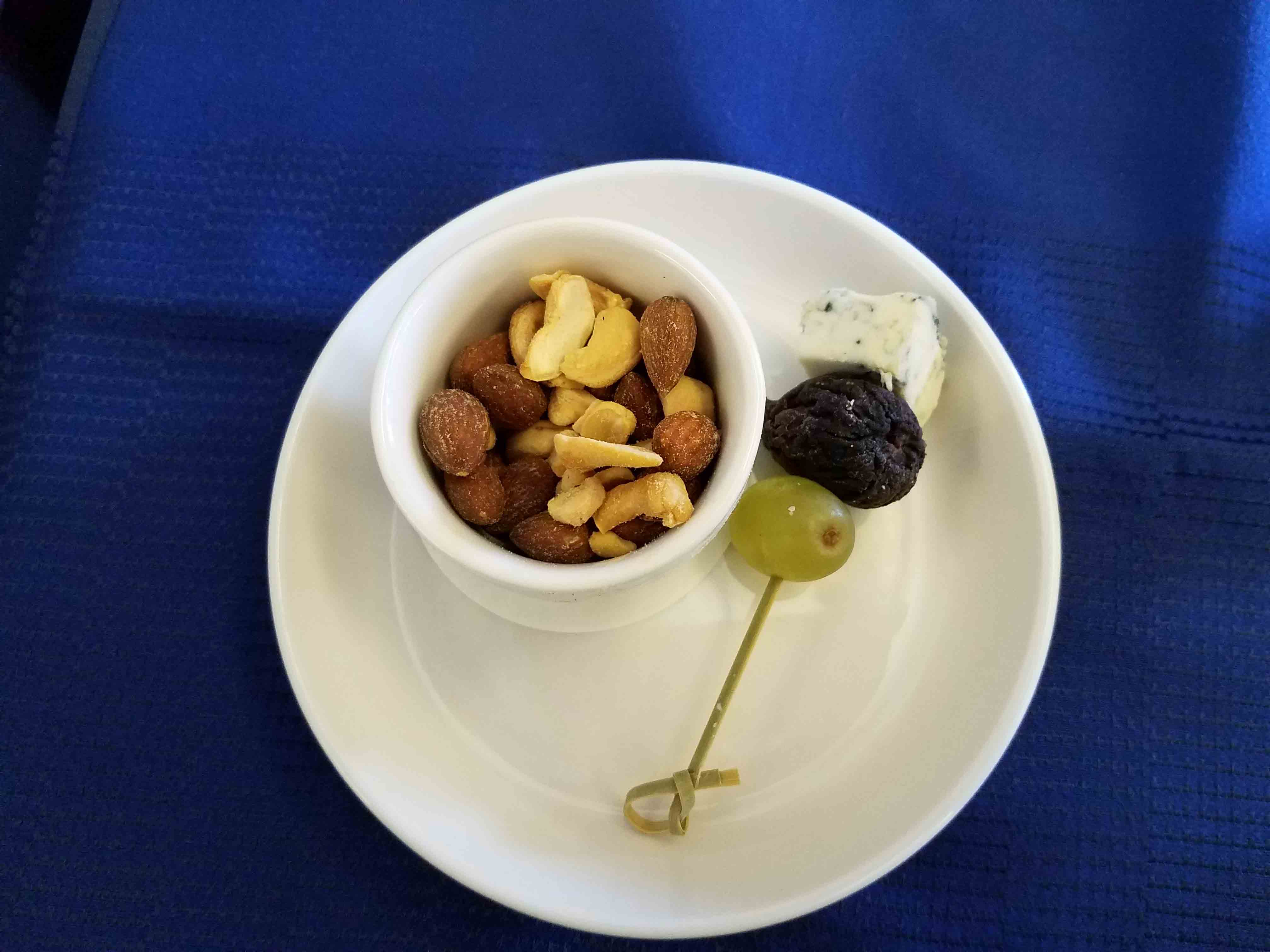 头盘最开始是一些坚果点心,以及一串不知名的东西。看了菜单才知道是蓝纹芝士串无花果干串一颗葡萄,尝了一口感觉实在是难吃。还不如来一串三颗葡萄算了。