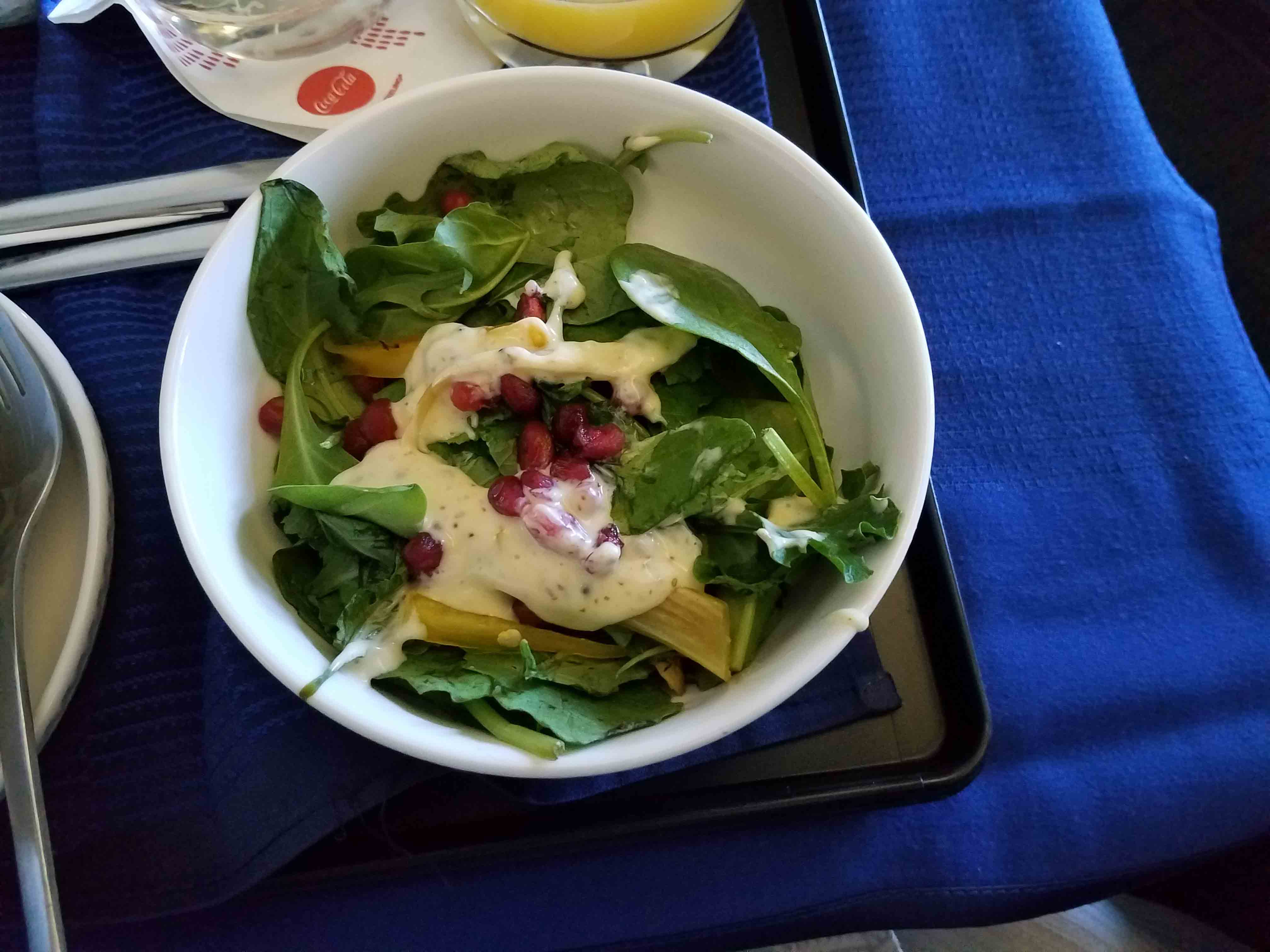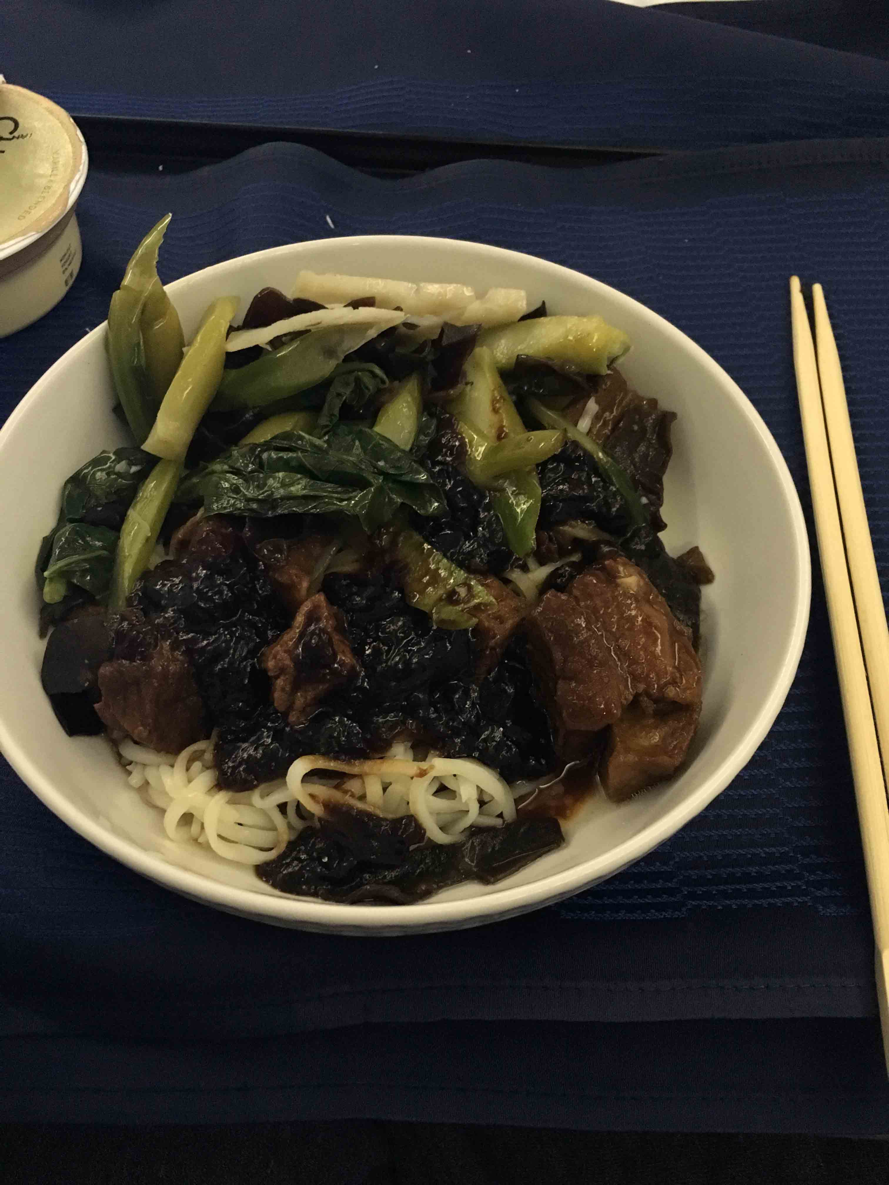 起飞不久,乘务员奶奶就开始询问是否开始要上餐了。虽然我们之前在休息室都吃的饱饱的,还是打算赶紧吃完就开始休息一下。于是正餐就开始了。