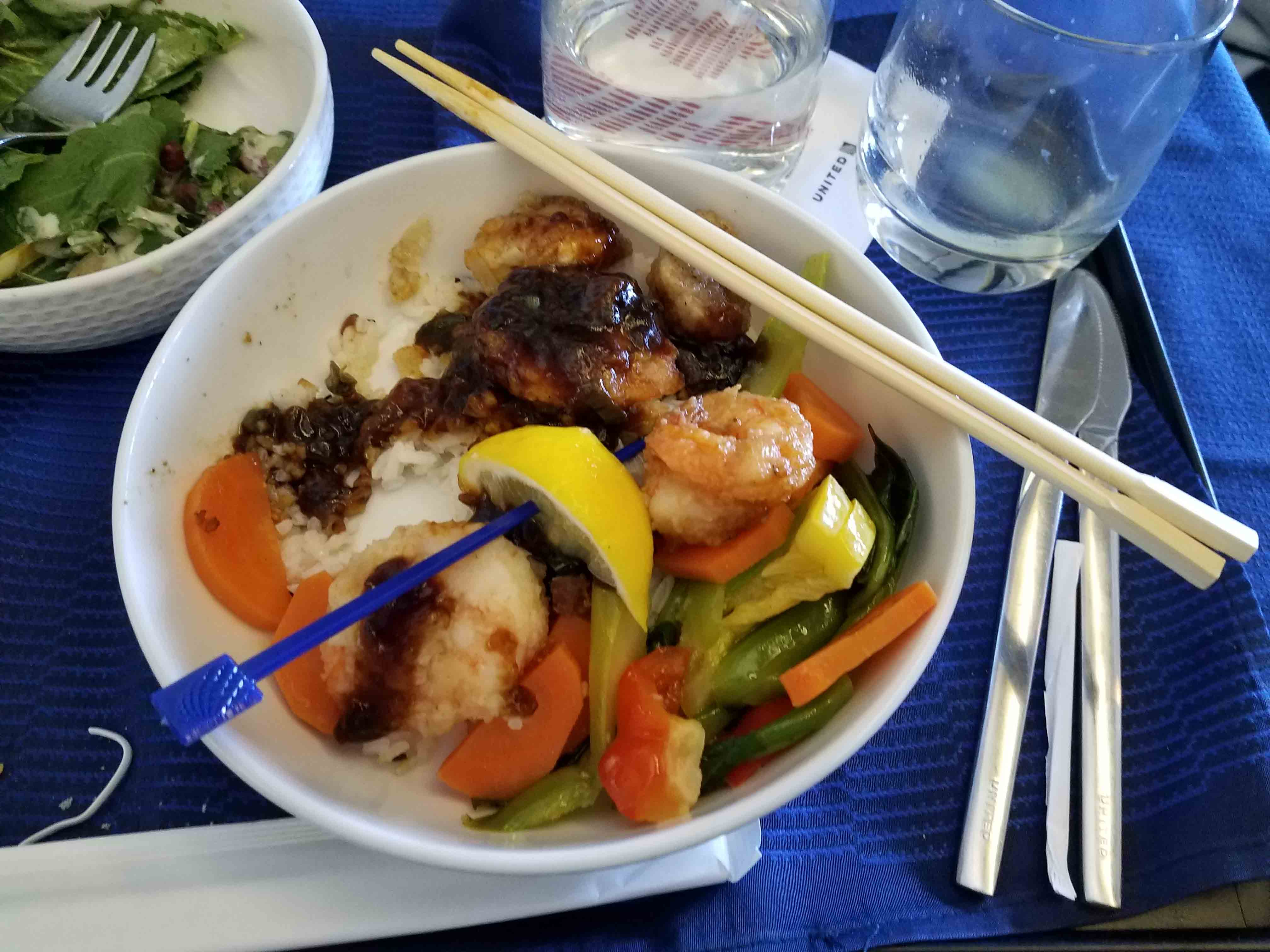 总体来说,虽然餐食一道一道得上,味道实在不敢恭维。头等舱还备了一些鸡肉饭,估计是经济舱的主食,我们后来点了一点,味道和正餐也差不多。