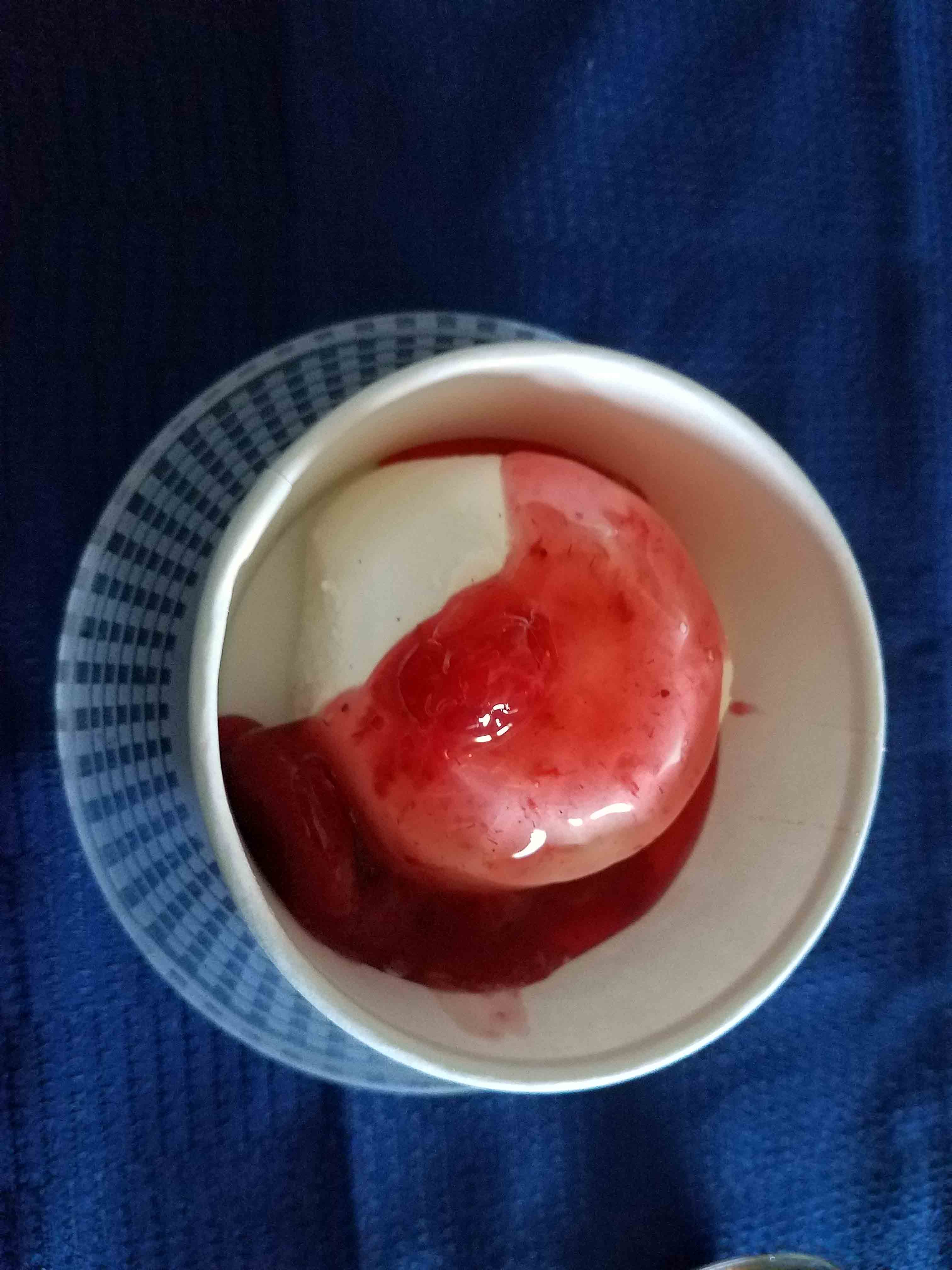 餐后甜品是不知名冰淇淋。冰淇淋本身味道还不错,浇的草莓酱实在太甜了。