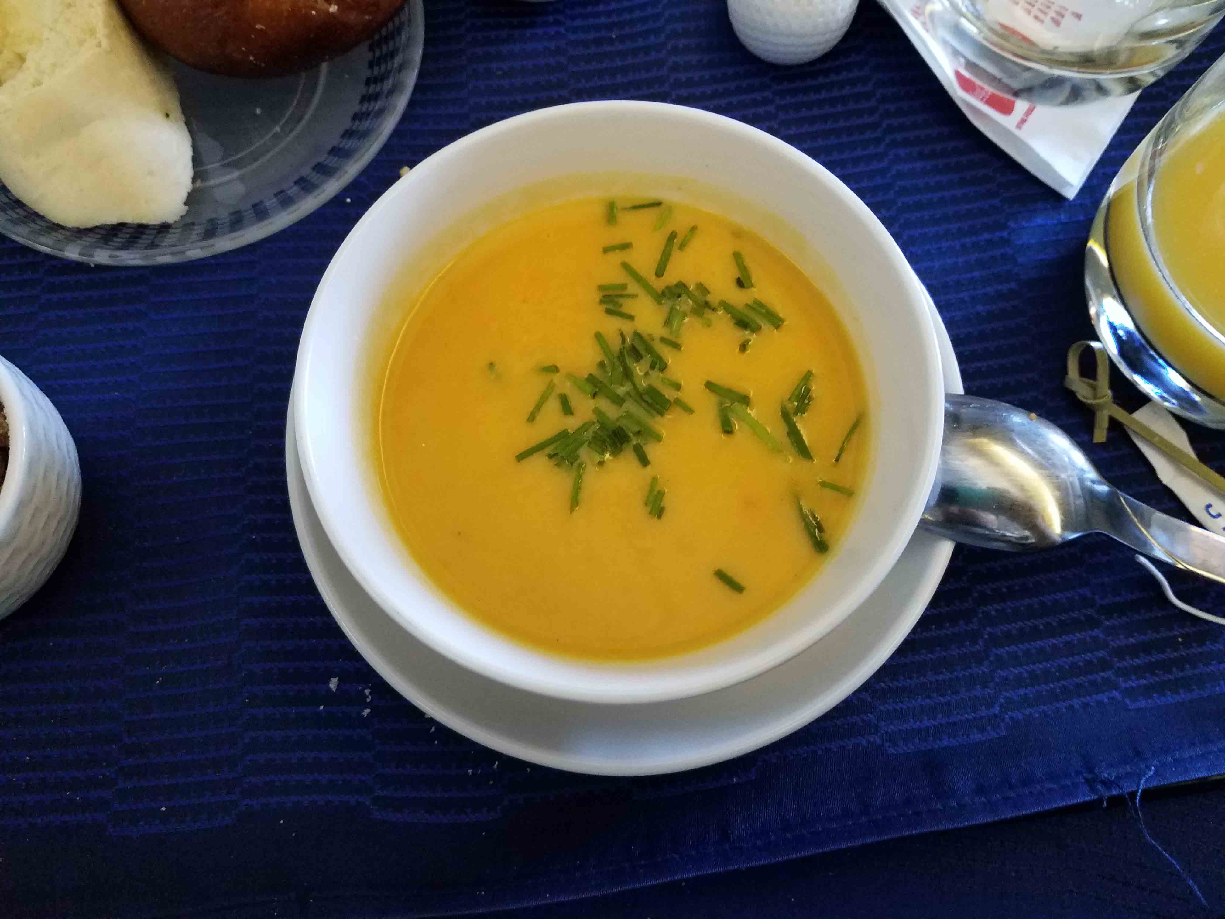 这道南瓜汤算是整个正餐中最好吃的了,基本做出了一般餐馆的水准。经过前两道菜的摧残,这道汤被我全消灭了。