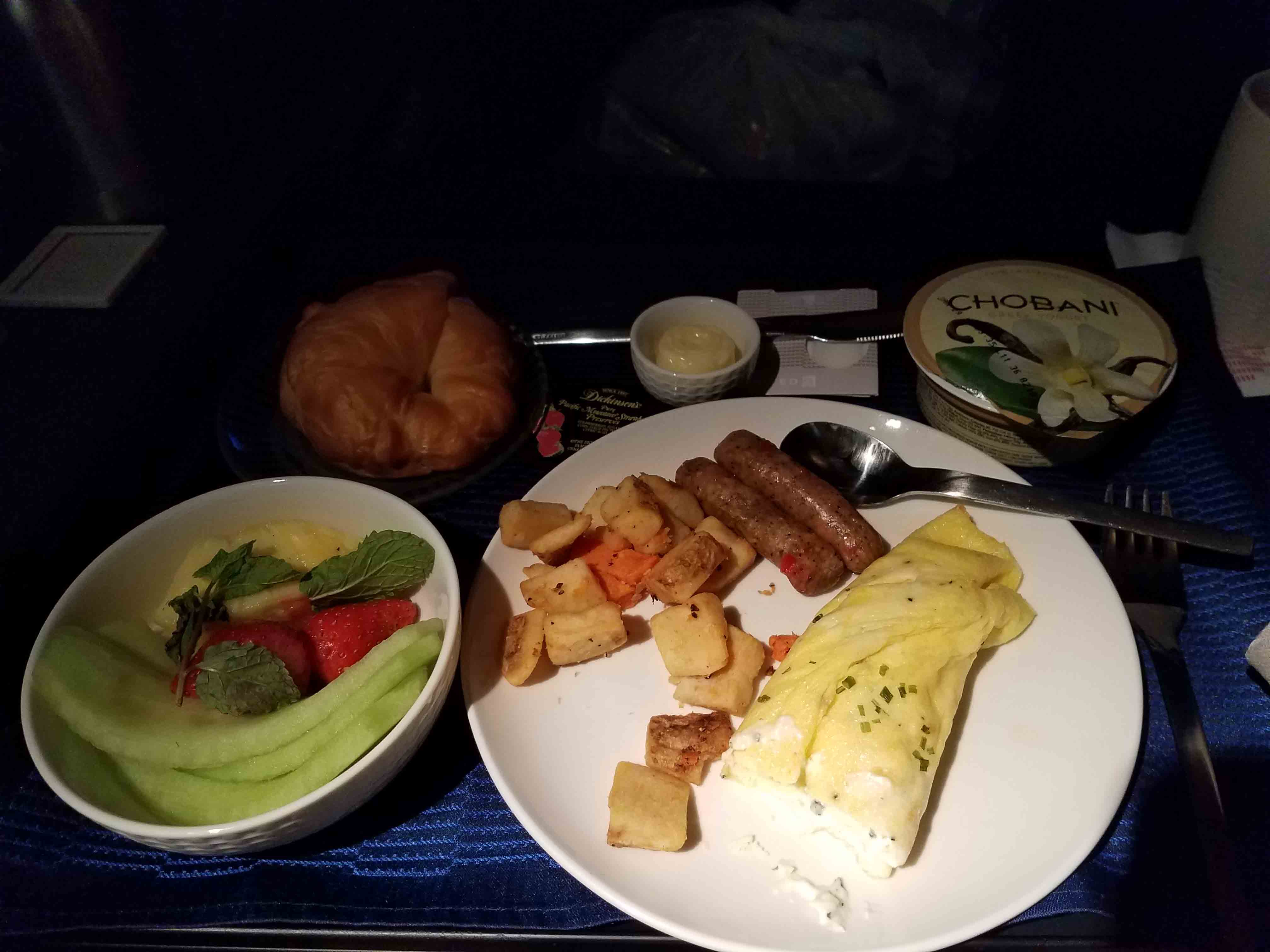 离到达 2 个小时的时候,乘务员奶奶再次出现,表示早餐要来啦!我点了普罗旺斯煎蛋卷,煎蛋卷里塞满了芝士,吃起来实在太腻了。香肠啥的味道还可以,最好吃的还是水果。