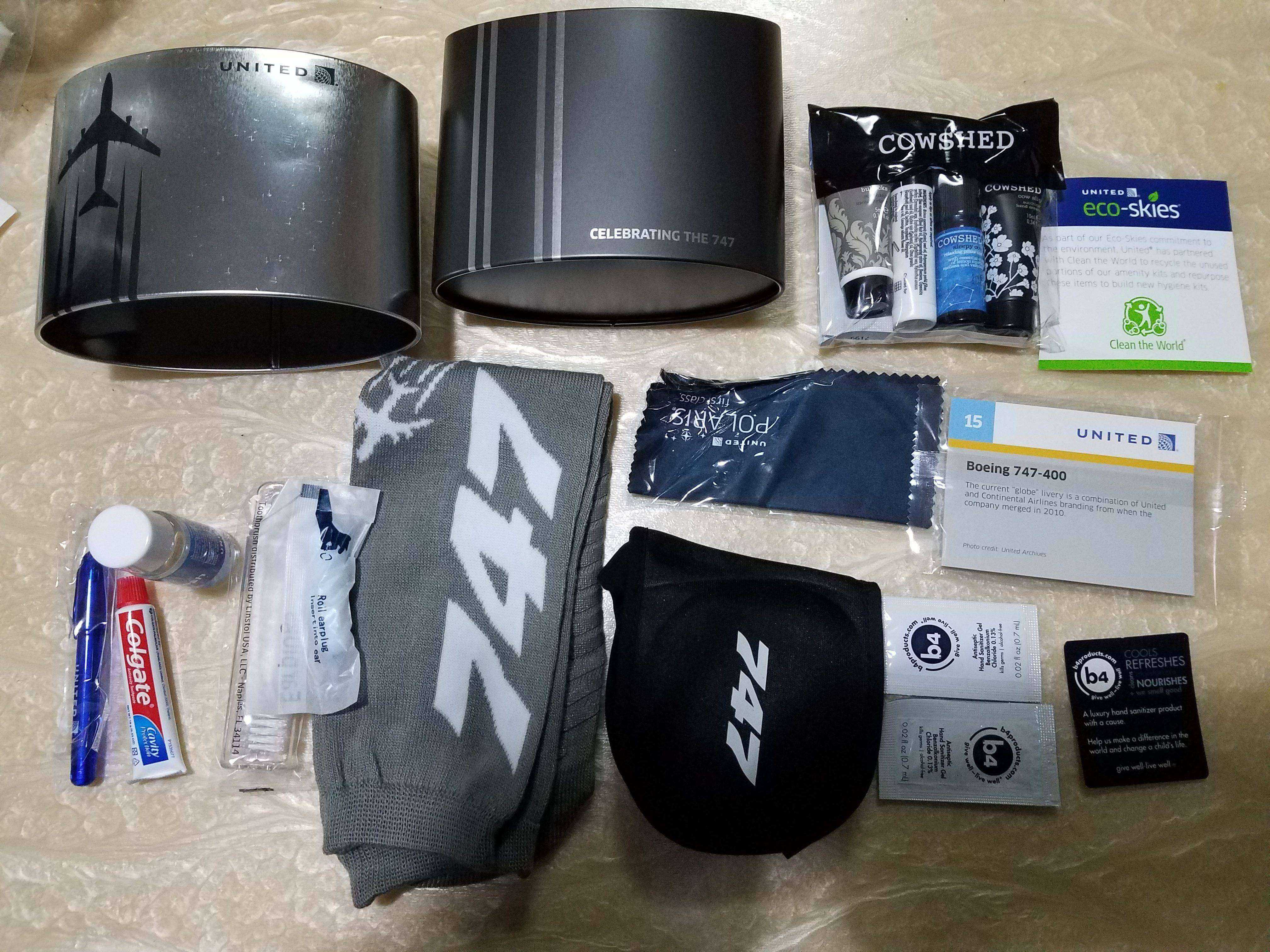 打开后有眼罩、各种洗漱用品,居然还有一双袜子。